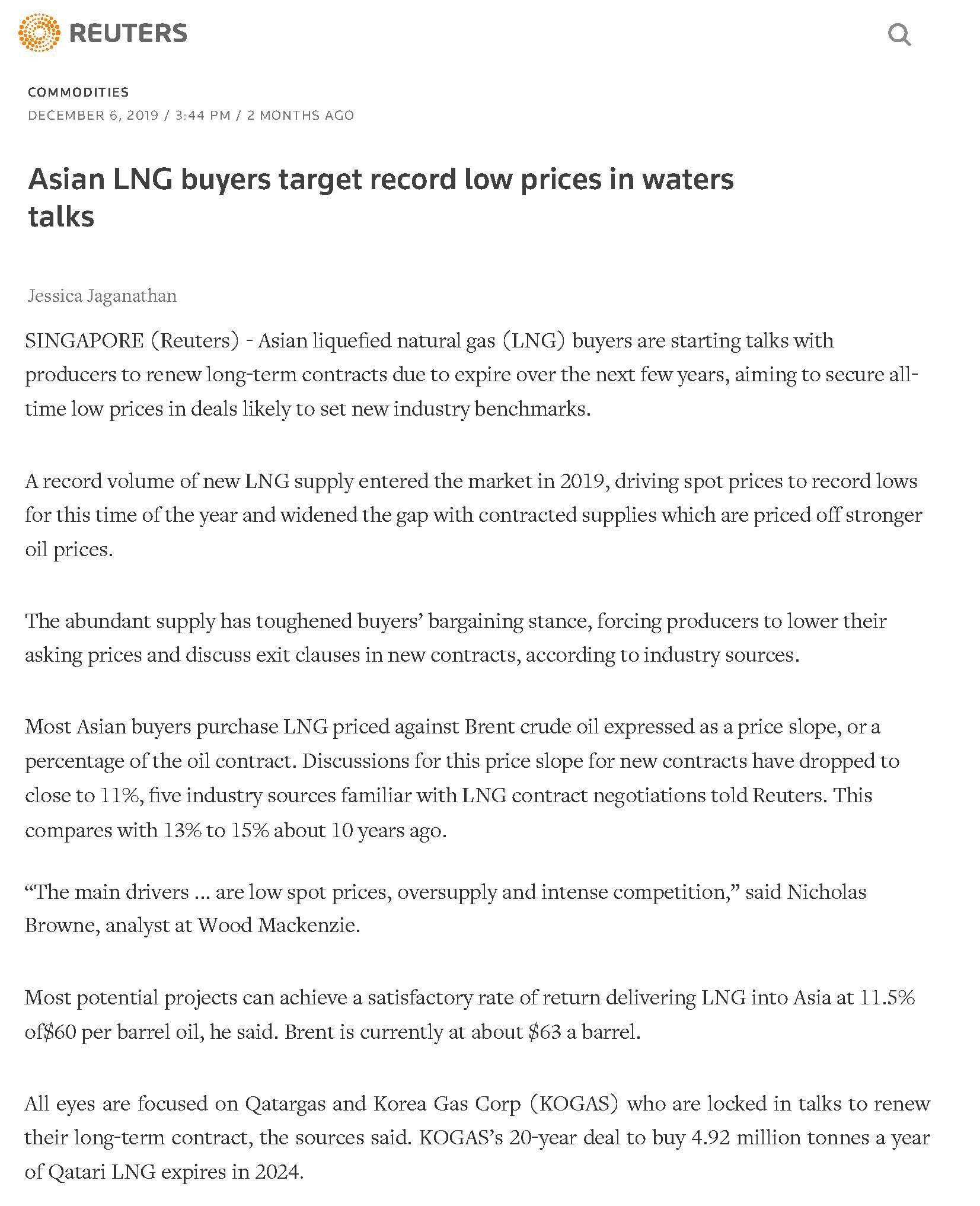 It’s groundhog day again for the LNG market. Oil indexing for long-term contracts have produced huge disparities with the spot market. Asian buyers have always been willing to pay a premium for stability of supply but with excess capacity coming online every year, that mindset may slowly change. Liberalization of energy markets like in Japan also means that importers cannot pass the costs down to end users and they may start taking a more aggressive approach towards the costs of their imports in their price review negotiations. Perhaps this is why we are now seeing our first few gas price arbitrations in Asia. Baldev Bhinder speaks to Reuters on the LNG market.